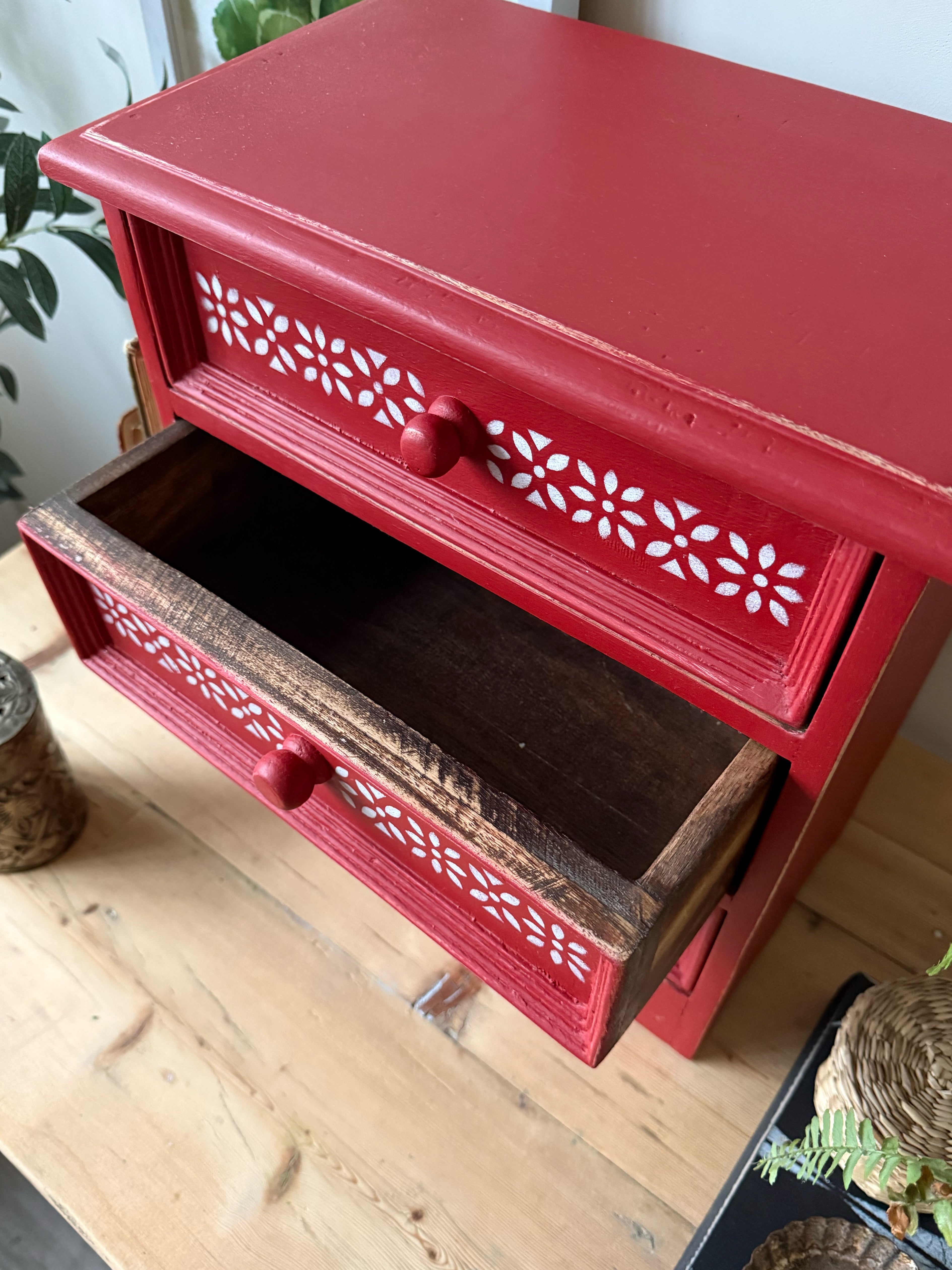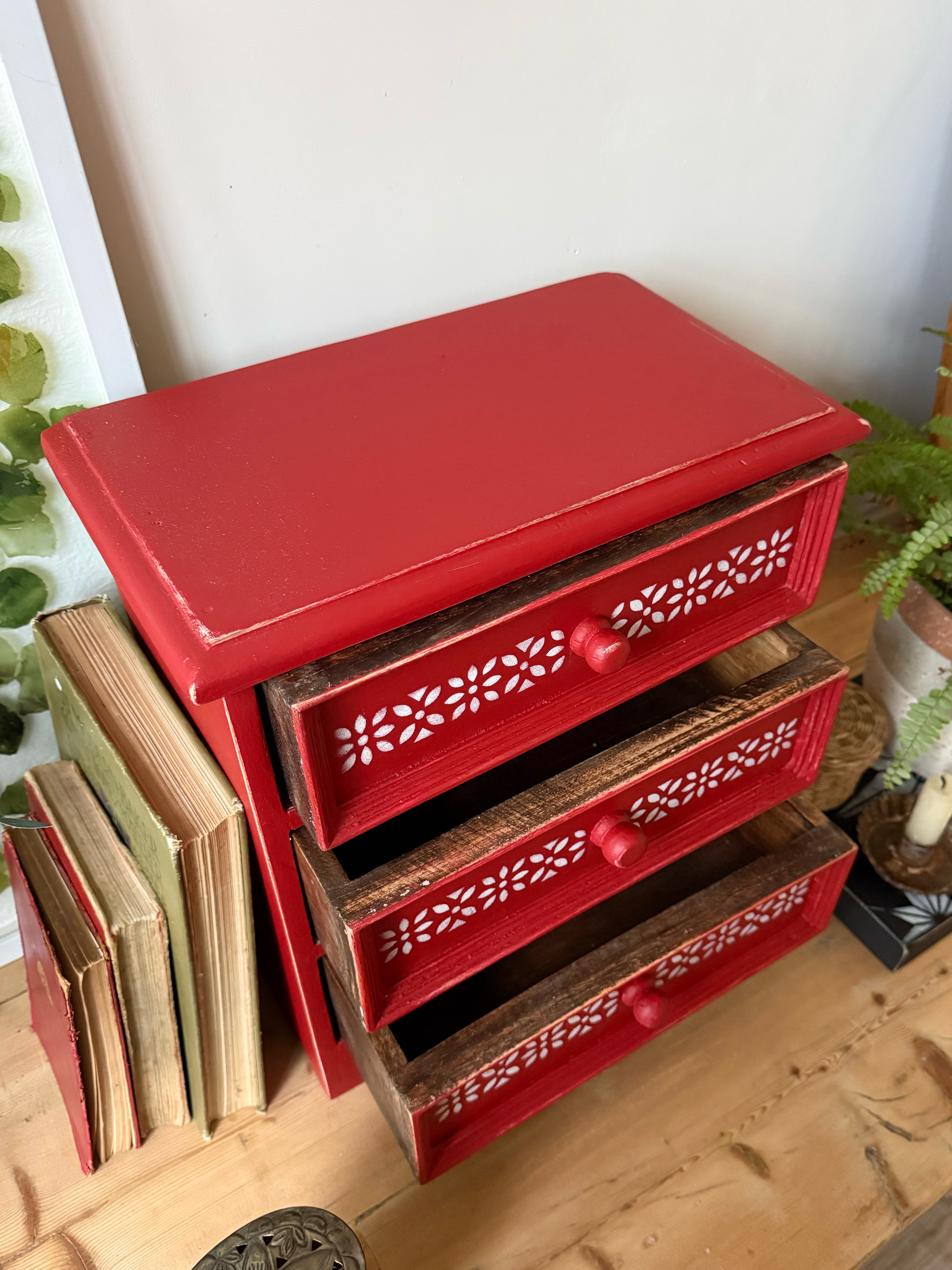 Add a splash of vibrant, rustic charm to your desktop, vanity, or shelf with this unique miniature chest of drawers. Lovingly hand-painted and detailed, this small chest serves as the perfect trinket box or jewellery storage solution, bringing a unique, repurposed touch to your home decor.