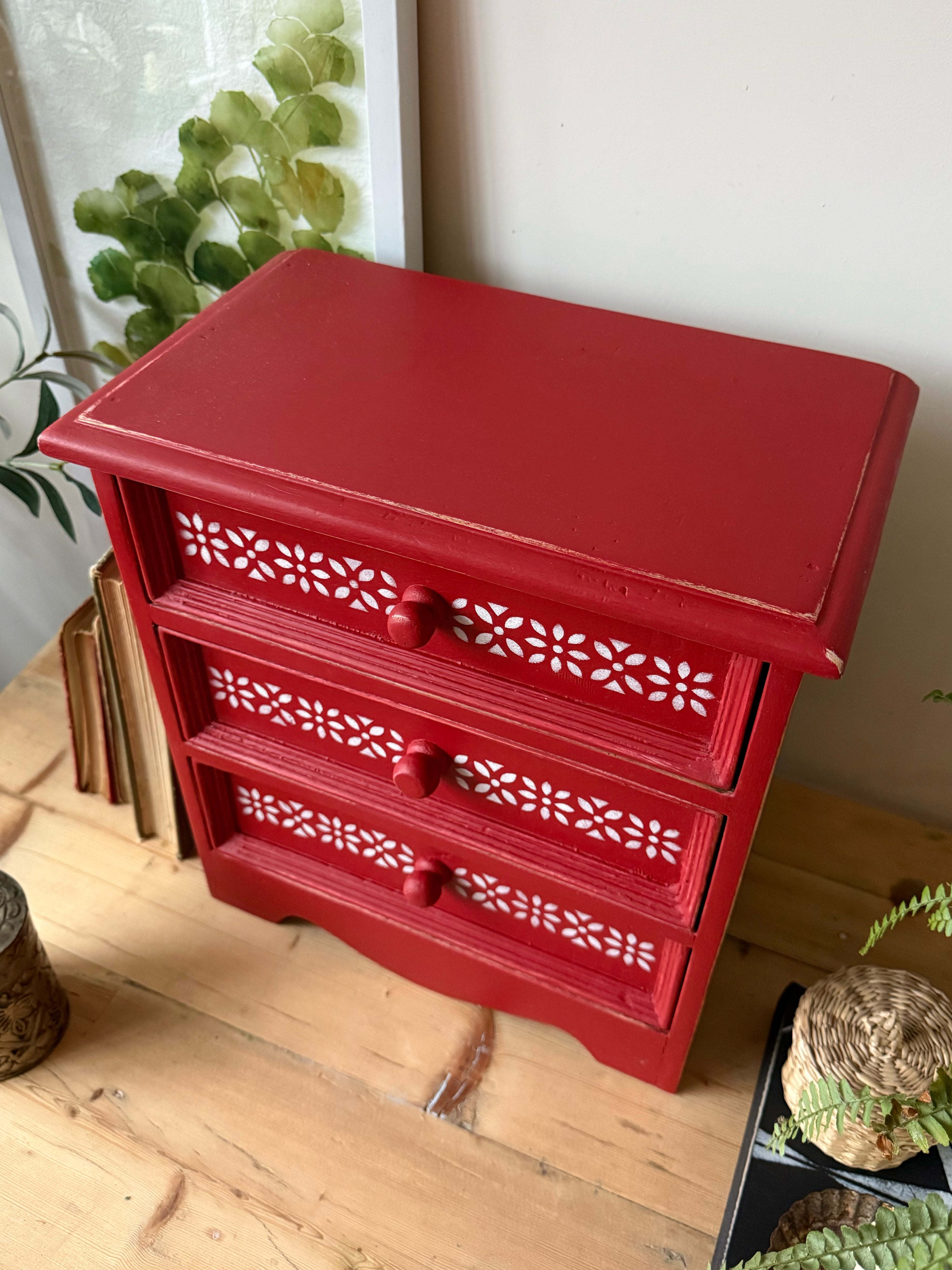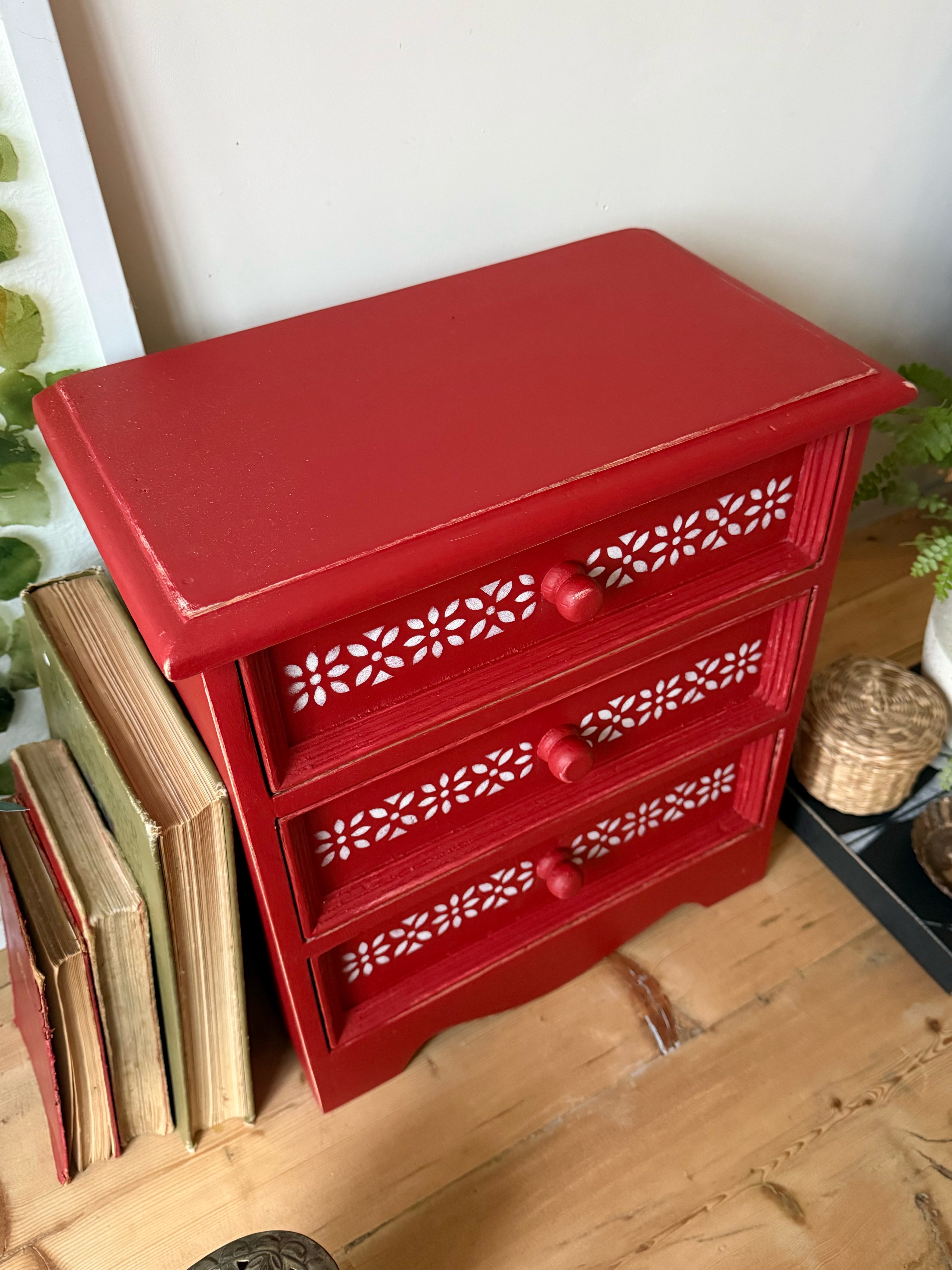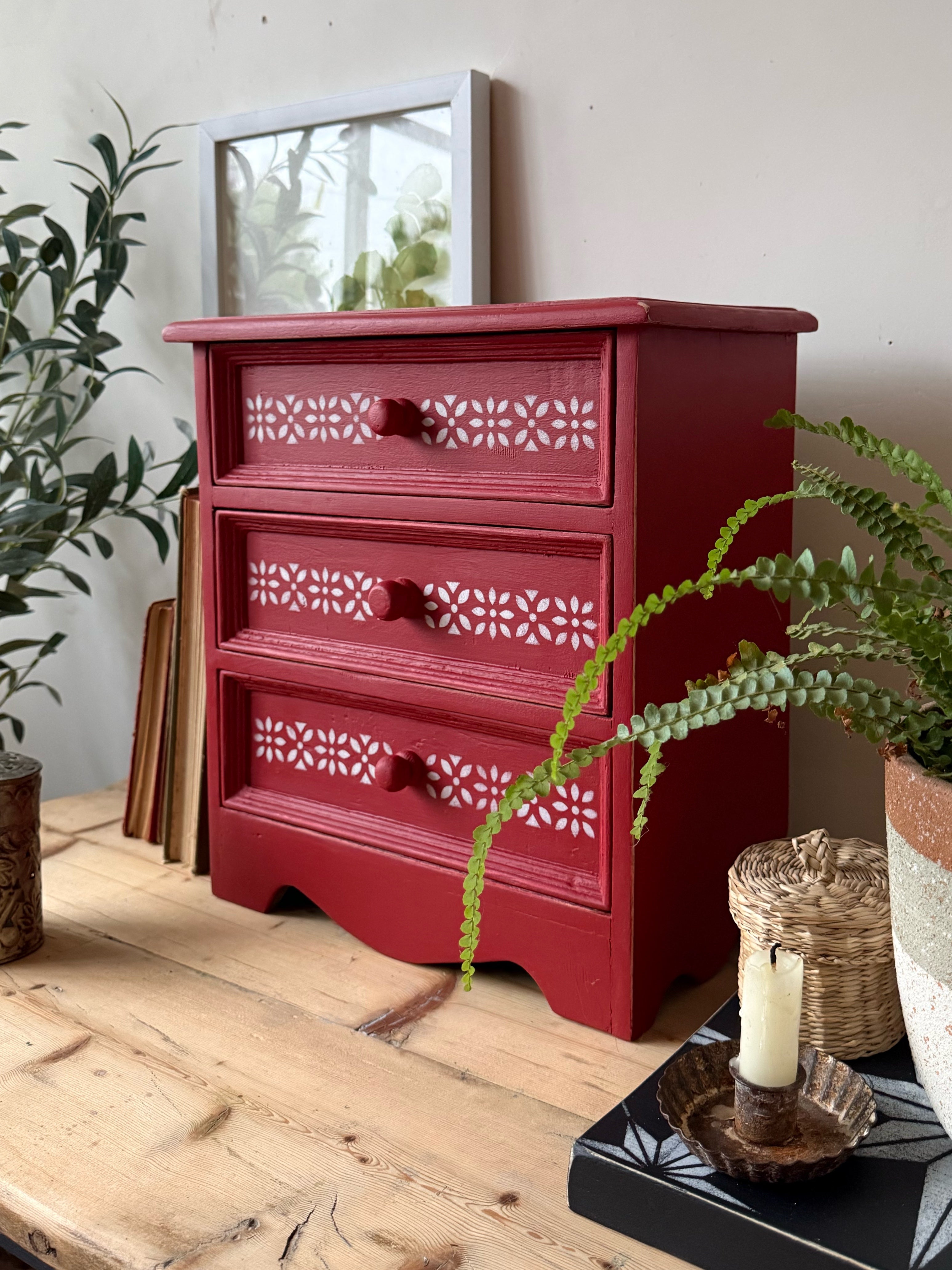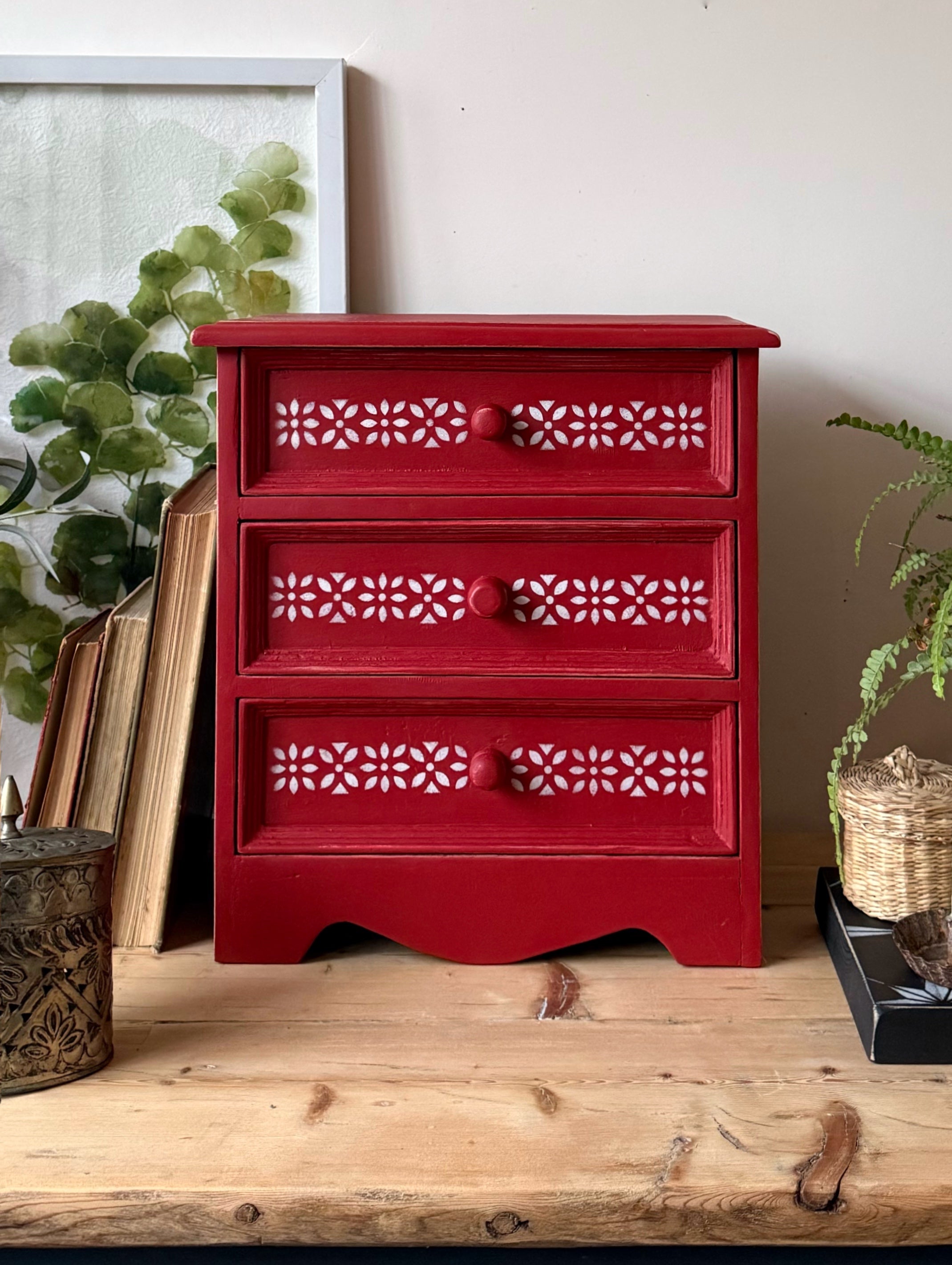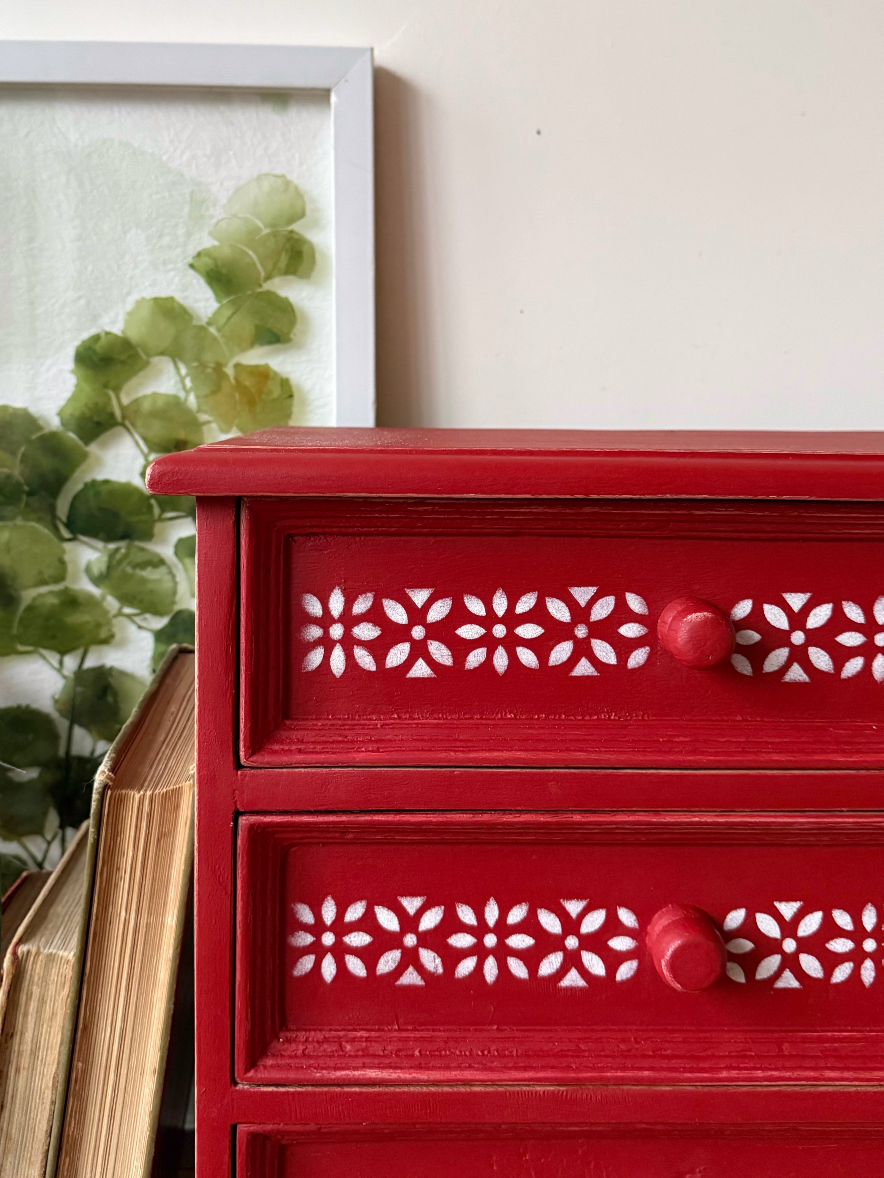 A delicate, repeating white geometric/floral pattern is stenciled across the front of all three drawers. This folk-art inspired detail beautifully contrasts with the deep red and enhances its unique, handcrafted aesthetic.