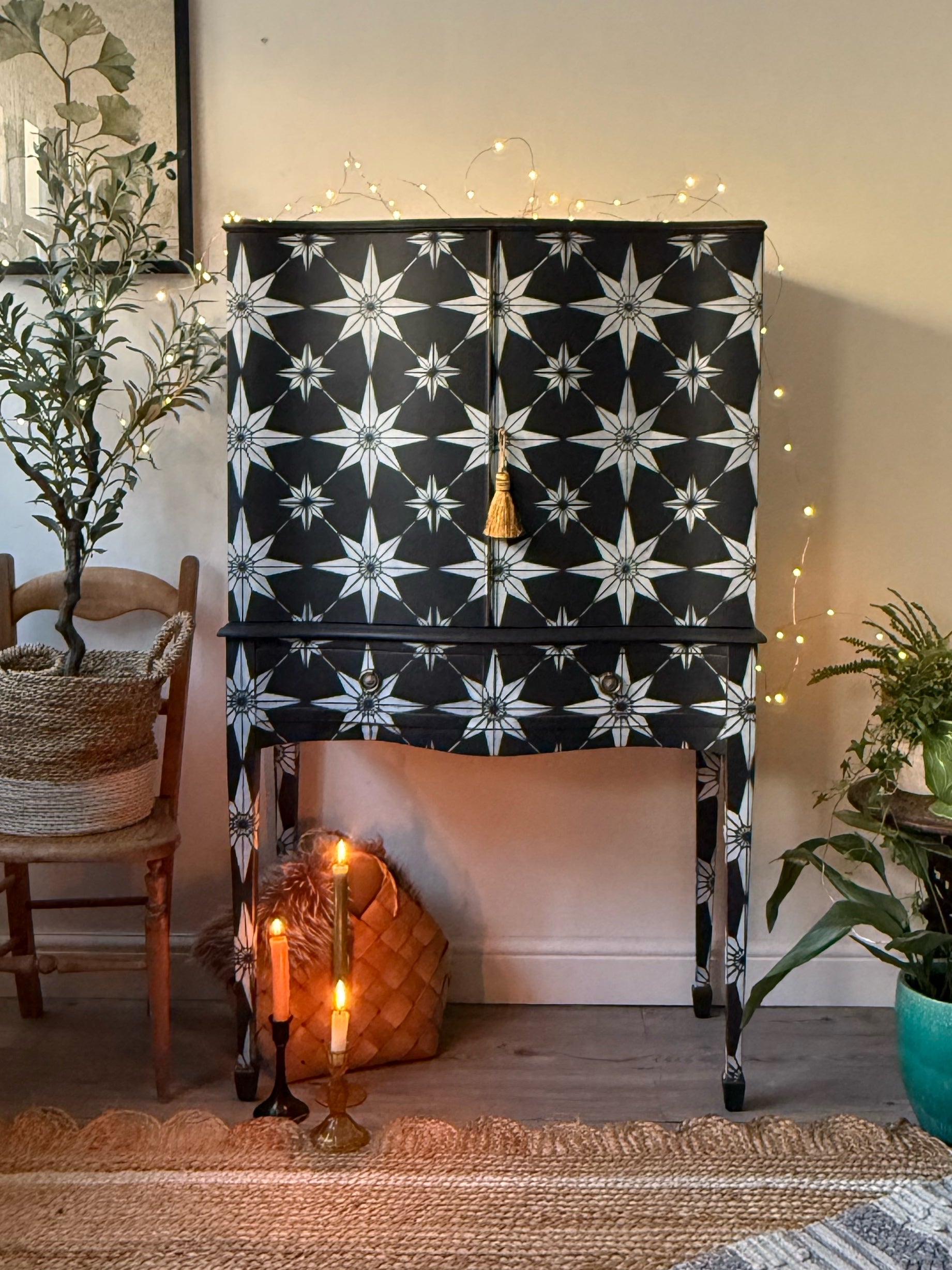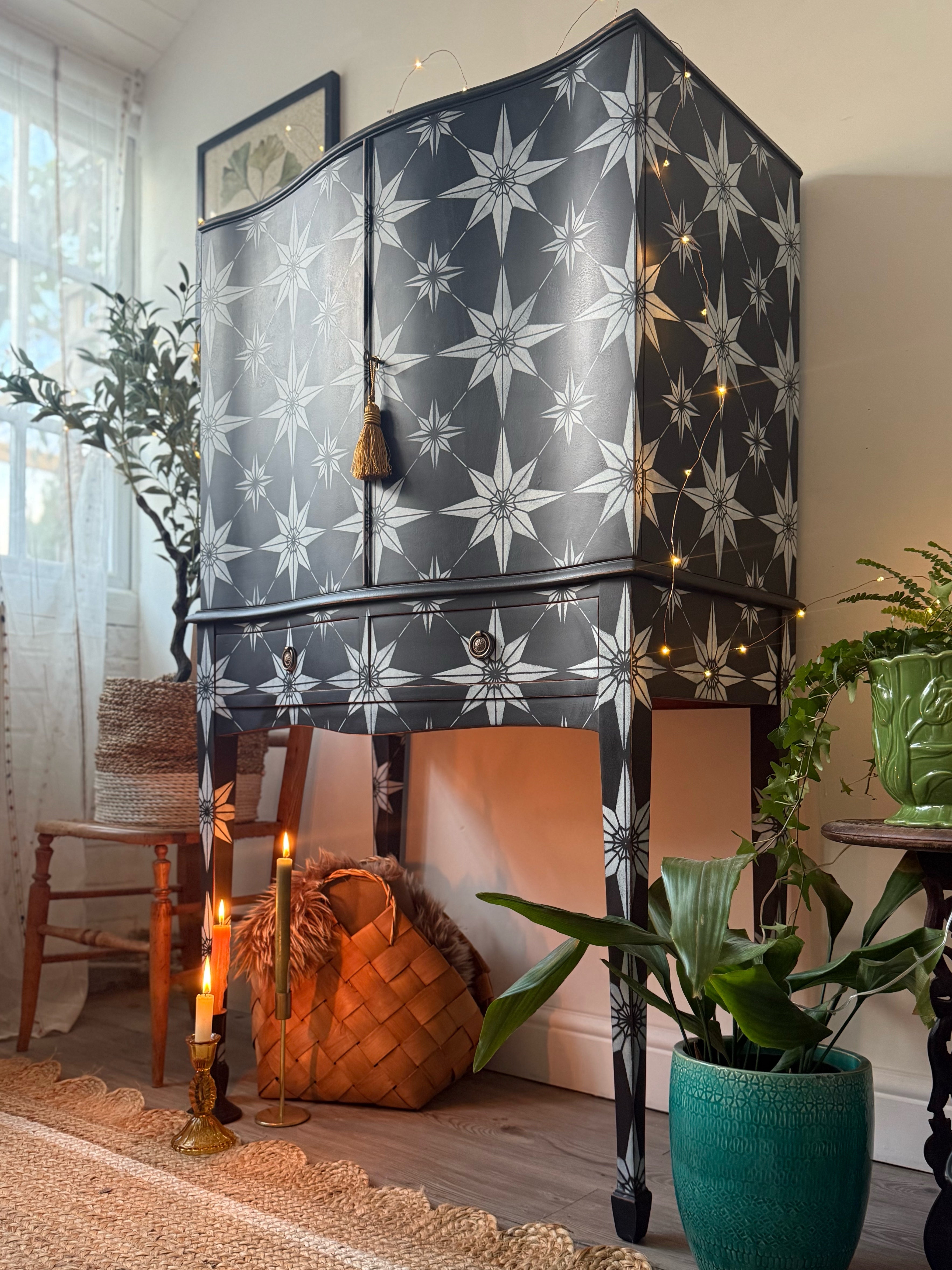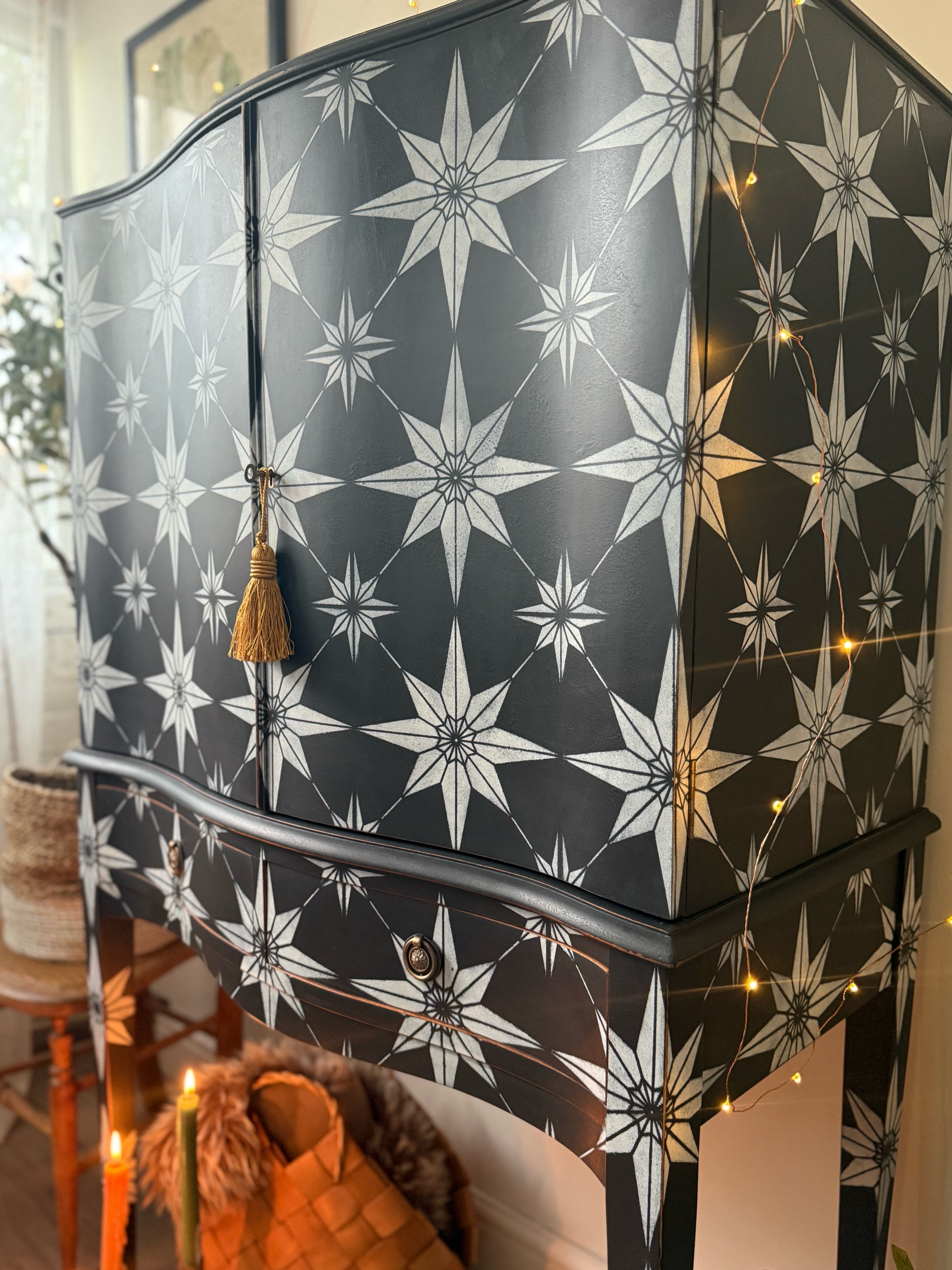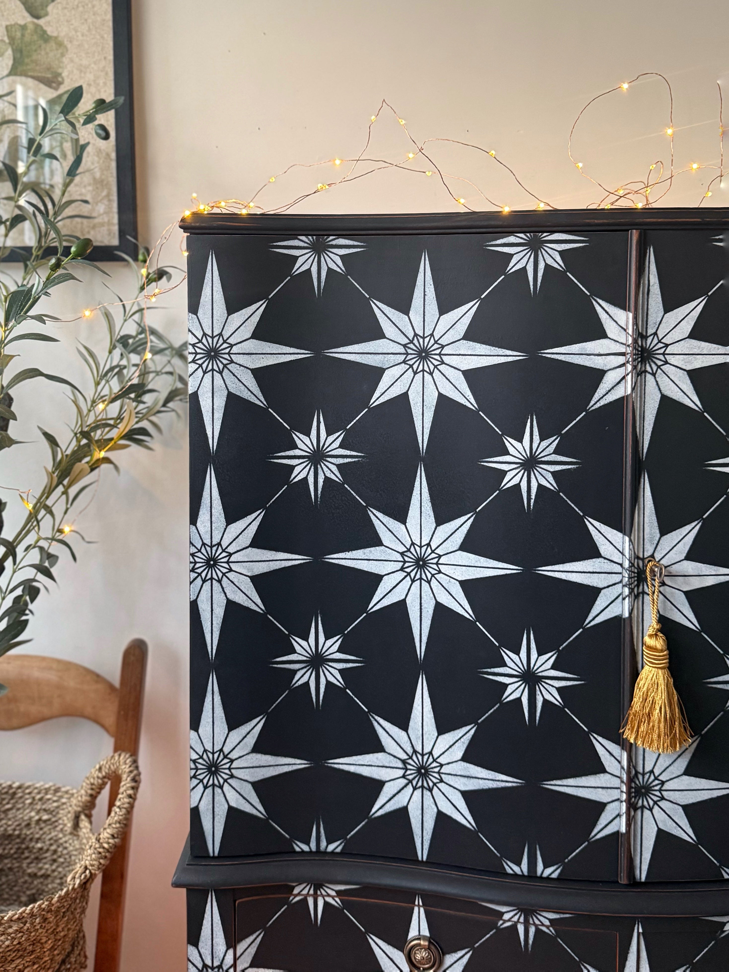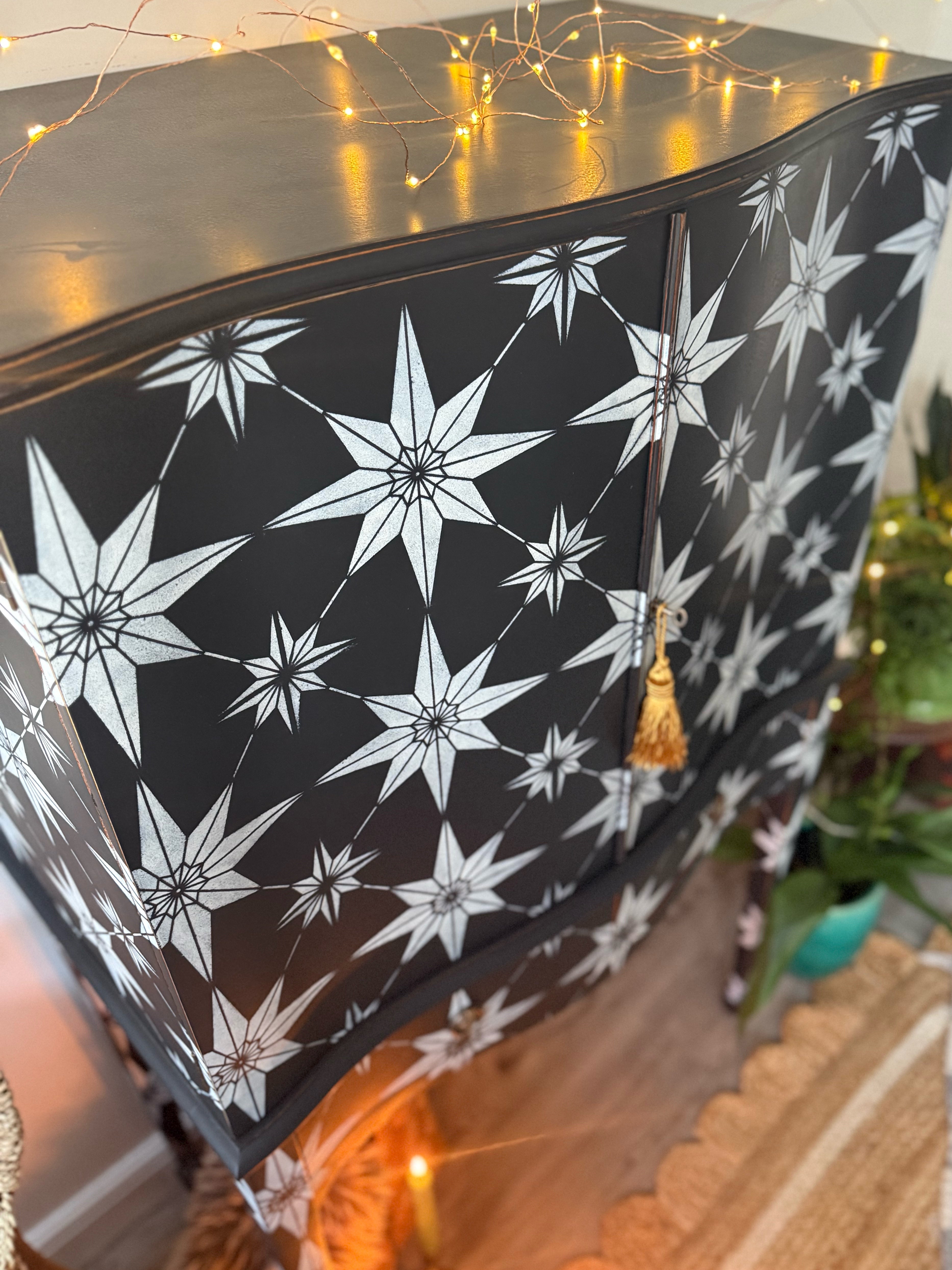 The exterior features a continuous geometric starburst pattern, which has been hand-painted in black and white.