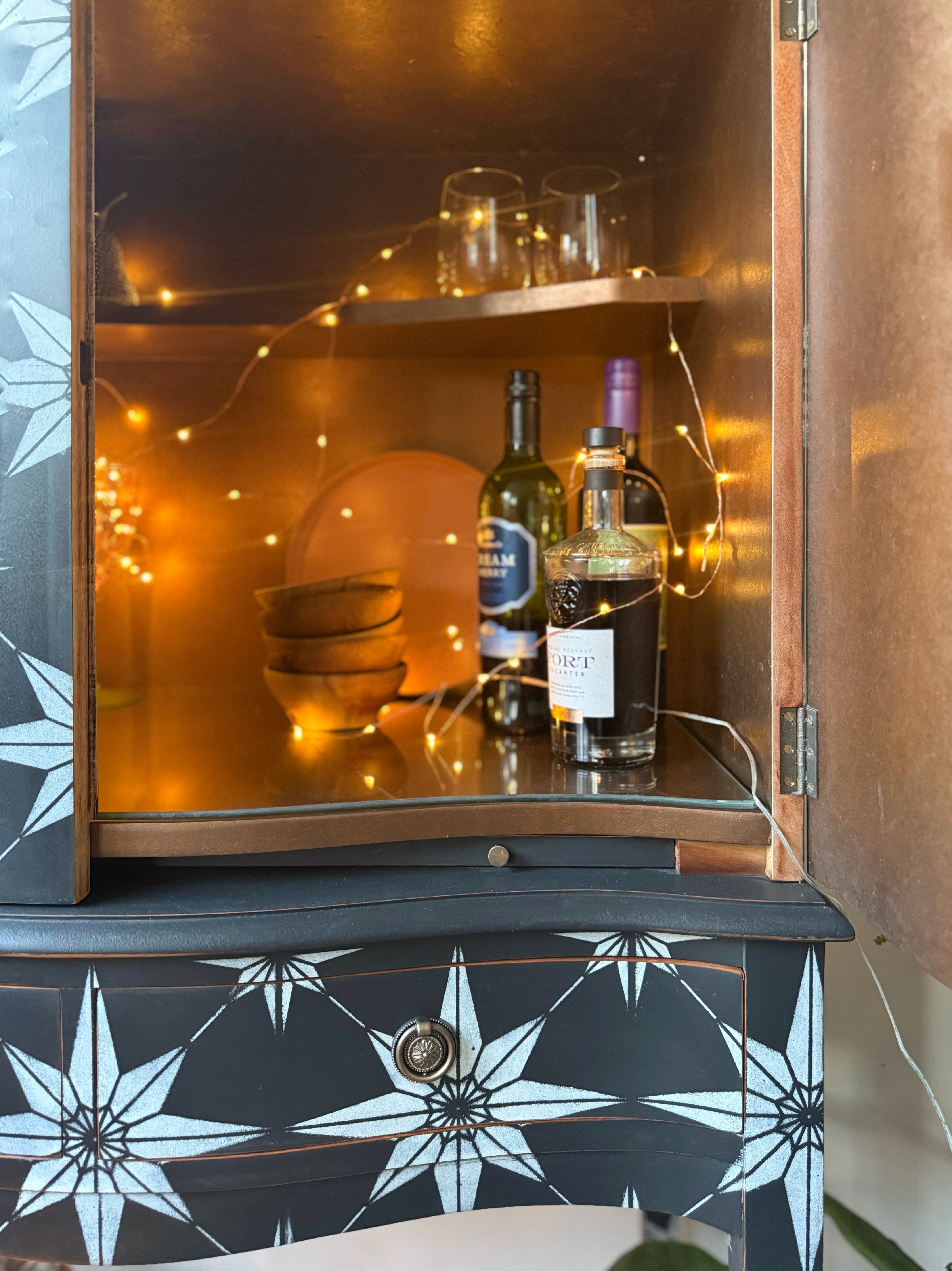 The interior of the cabinet offers a sophisticated contrast, finished in a warm copper and bronze metallic textured paint effect - complete with protective glass base for preparing drinks. This reflective lining provides the perfect backdrop for your spirits and glassware, adding an element of high-end glamour to every cocktail hour.
