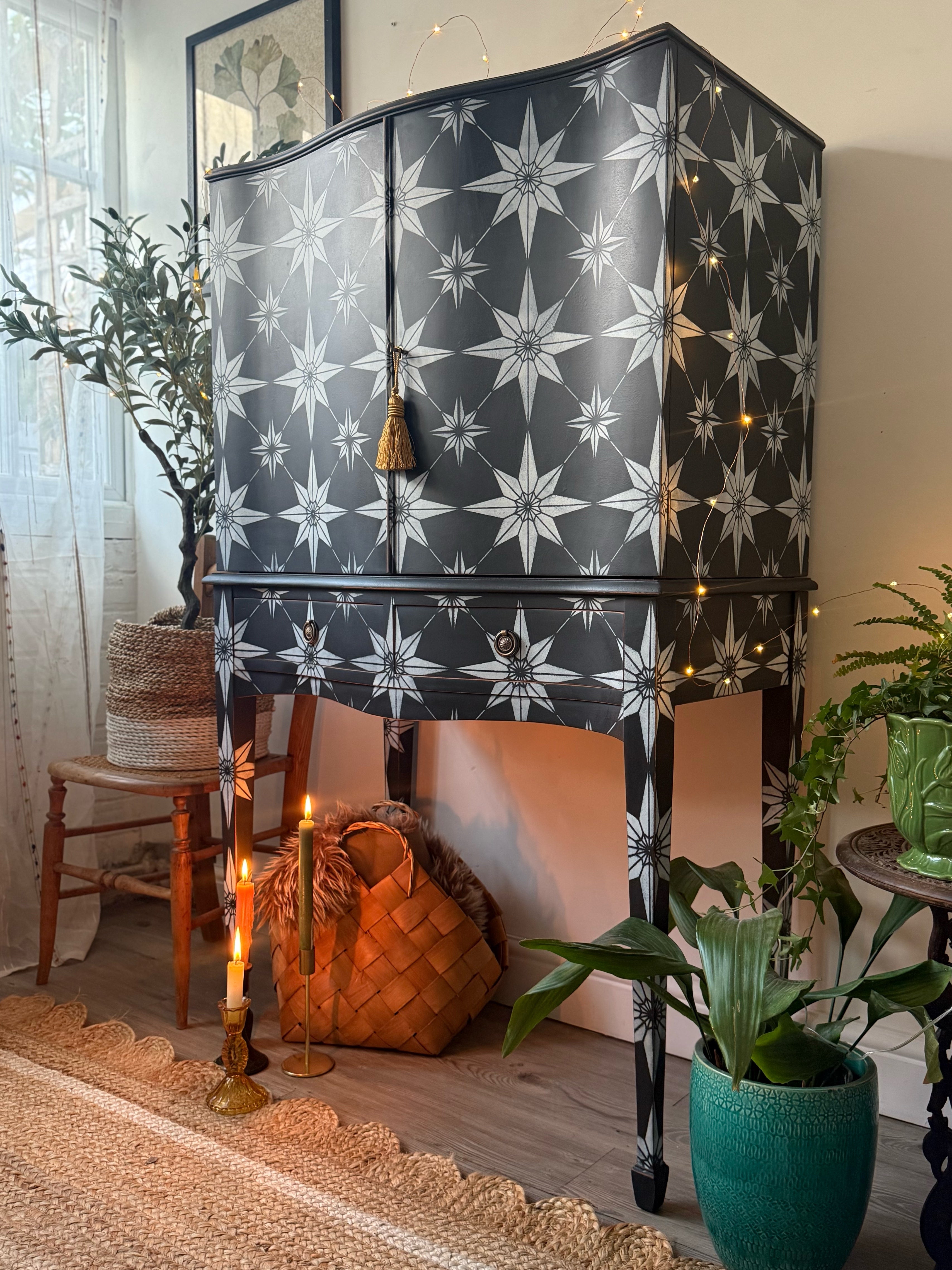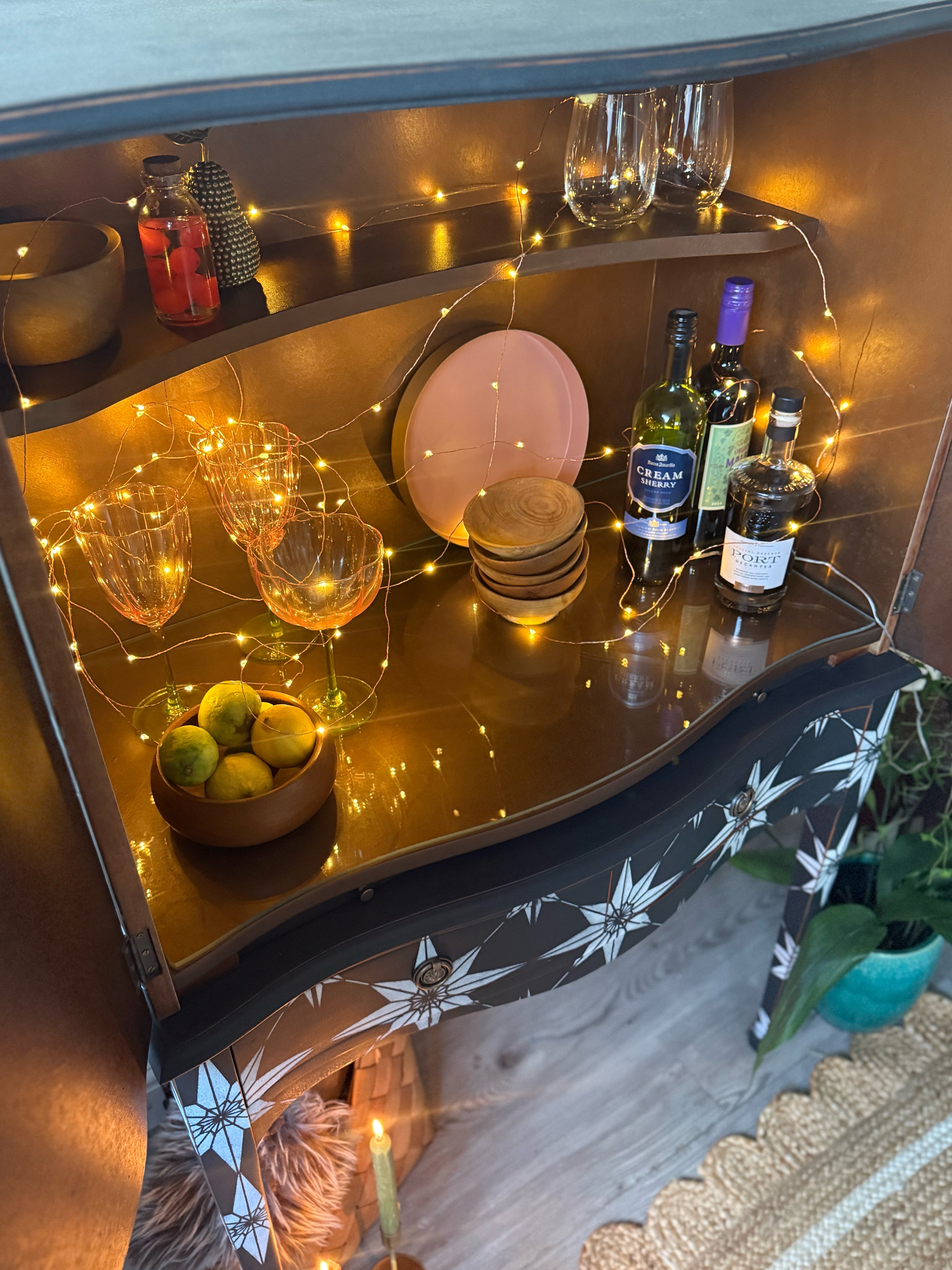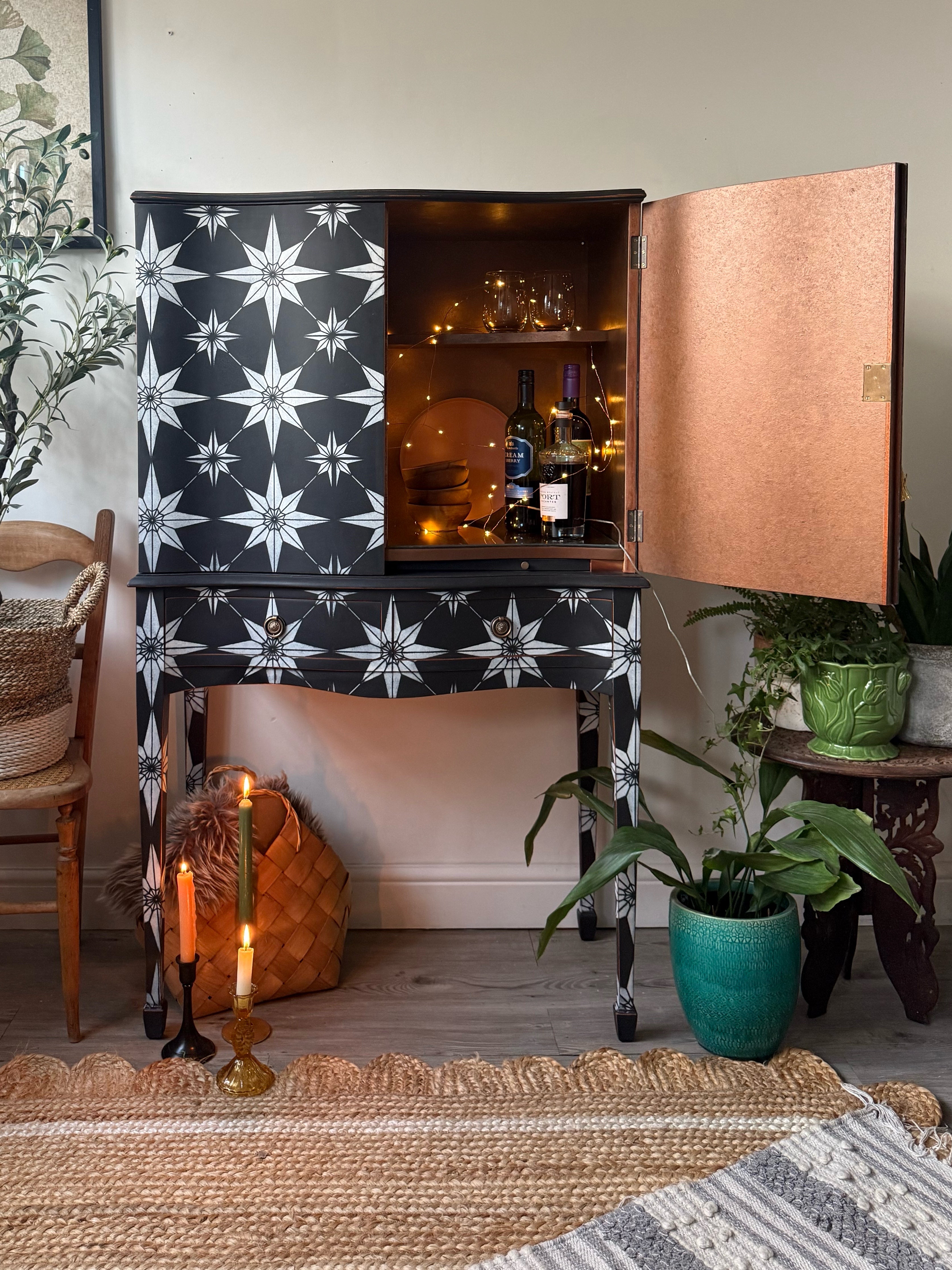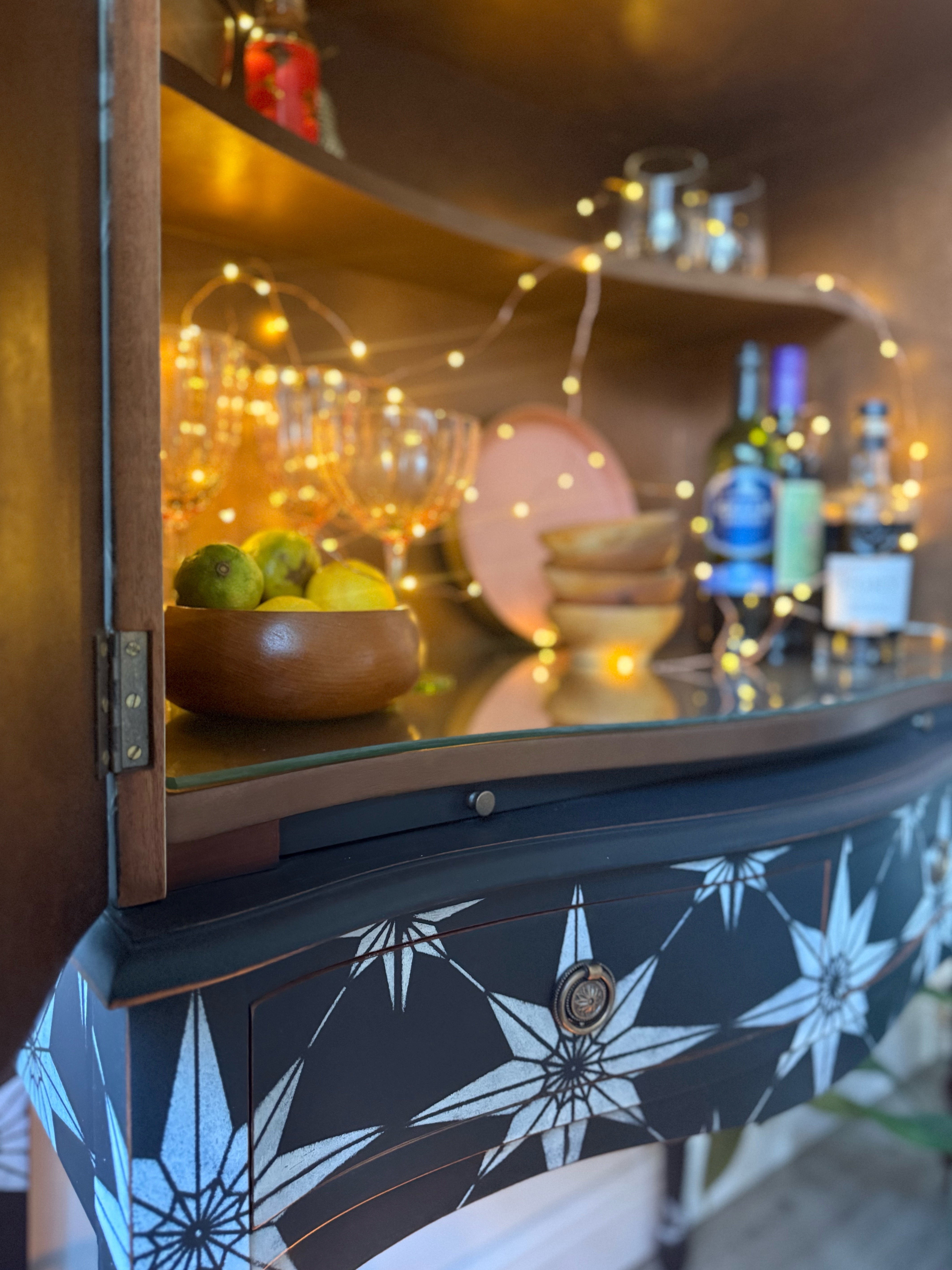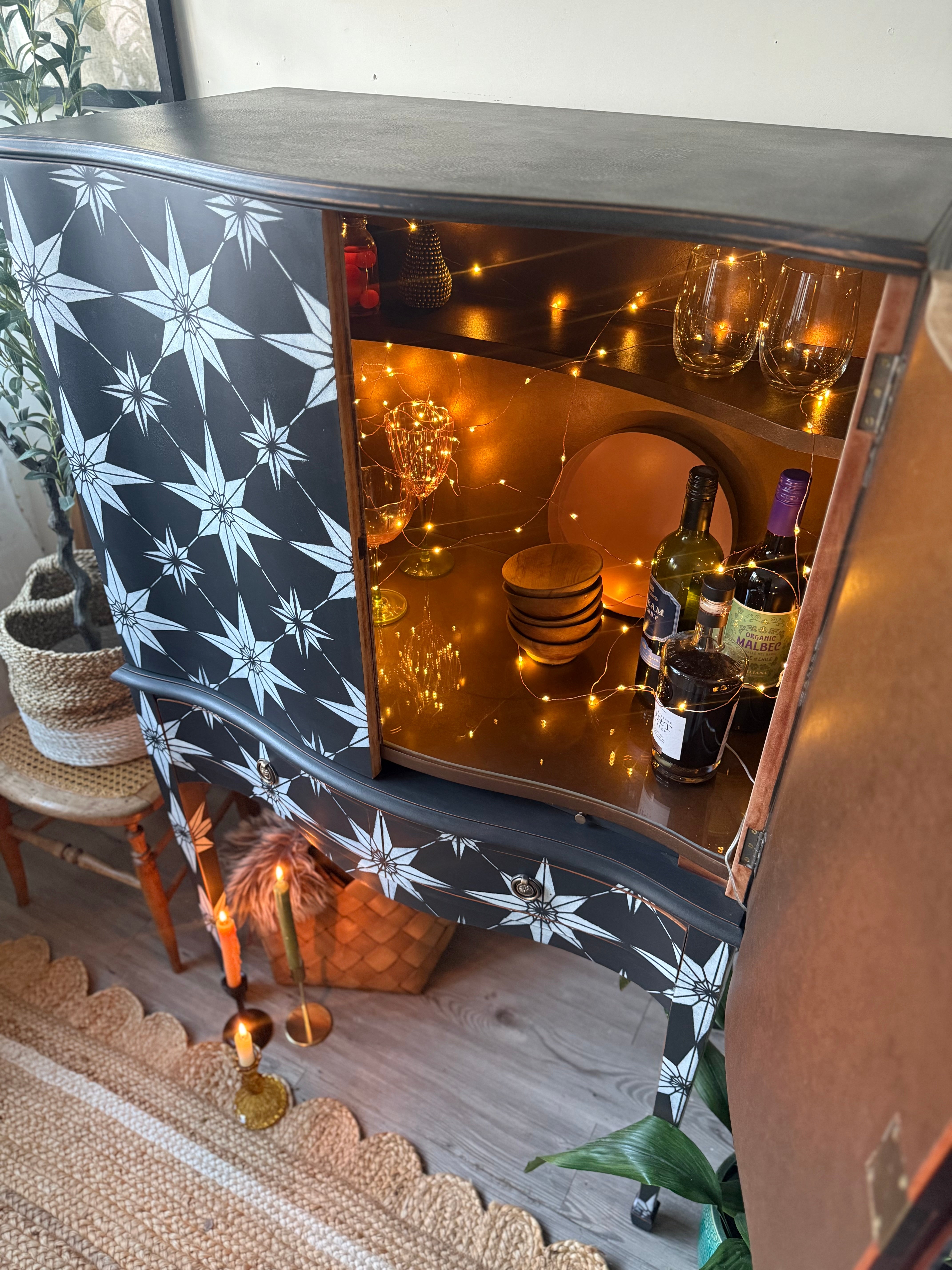 This curved front vintage cocktail cabinet has been given a striking update into a unique statement piece.