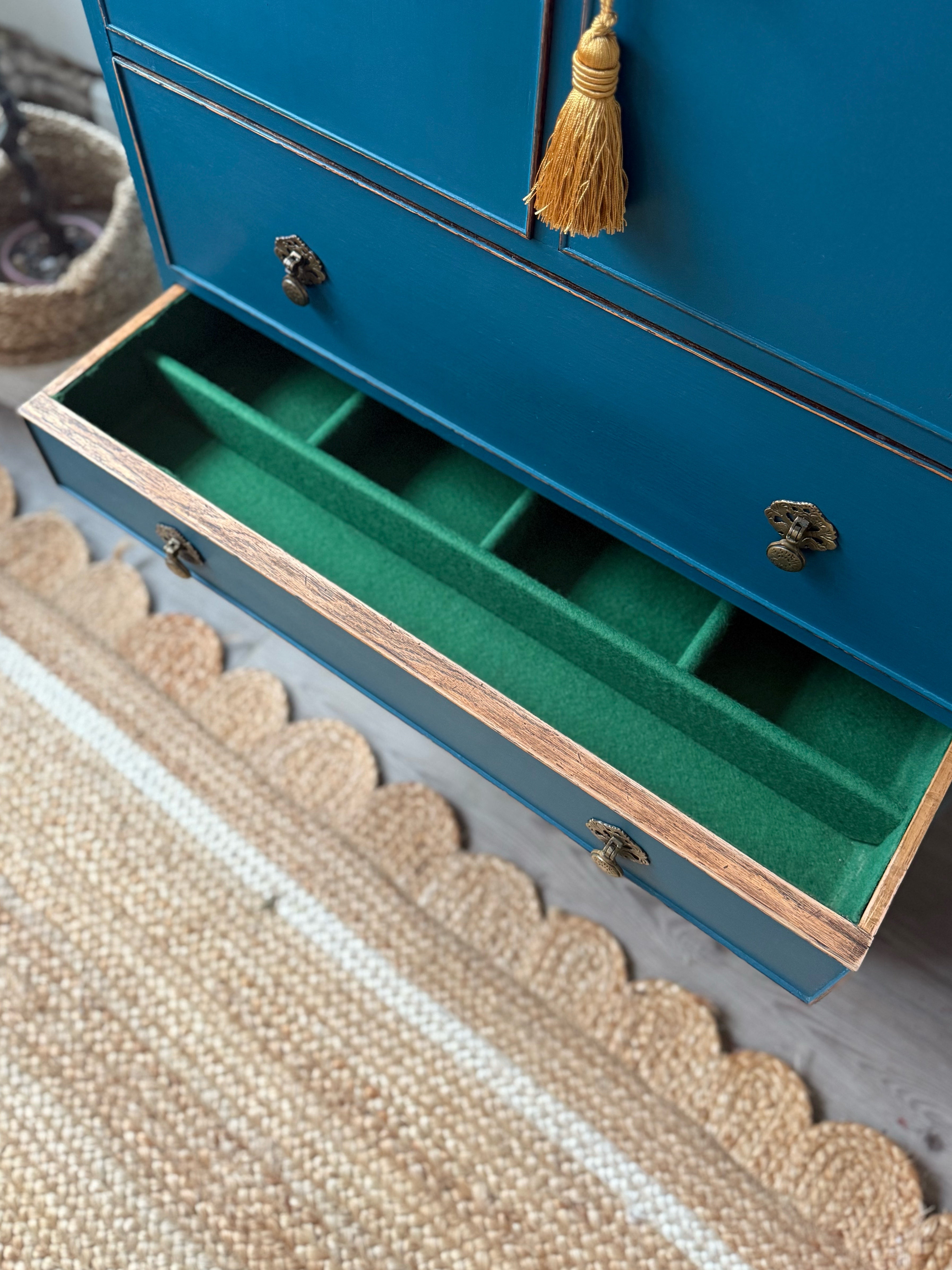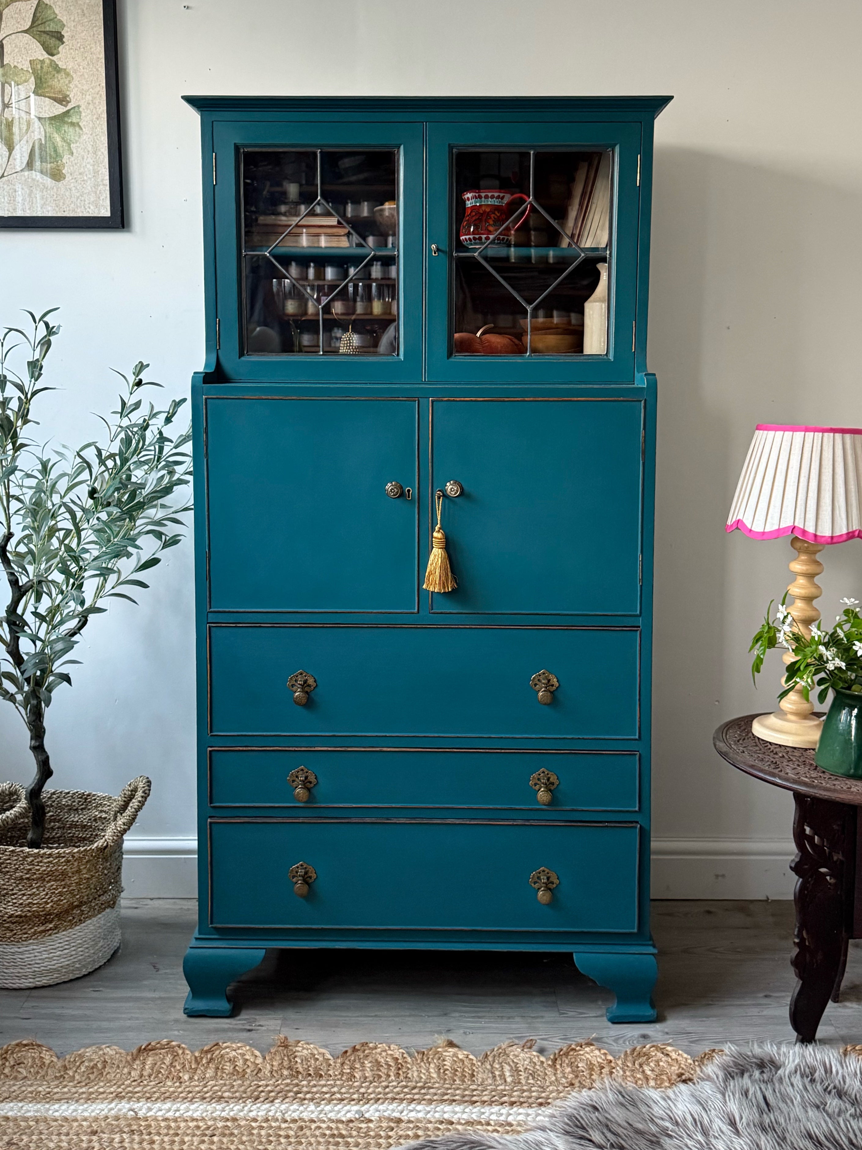 This handsome piece retains its original hardware on the doors and drawers, offering a beautiful, authentic contrast to the vibrant colour. Inside the drawers, you'll find the charming detail of the original green felt lining in the centre drawer. The upper and lower drawer have been cleaned and waxed to enhance the wood grain inners. The upper section features glass with diamond-patterned glazing bars, perfect for showcasing your favourite items. The lower cupboard area features two individual compartments which are large enough to store bottles, making it perfect for a drink or cocktail cabinet.