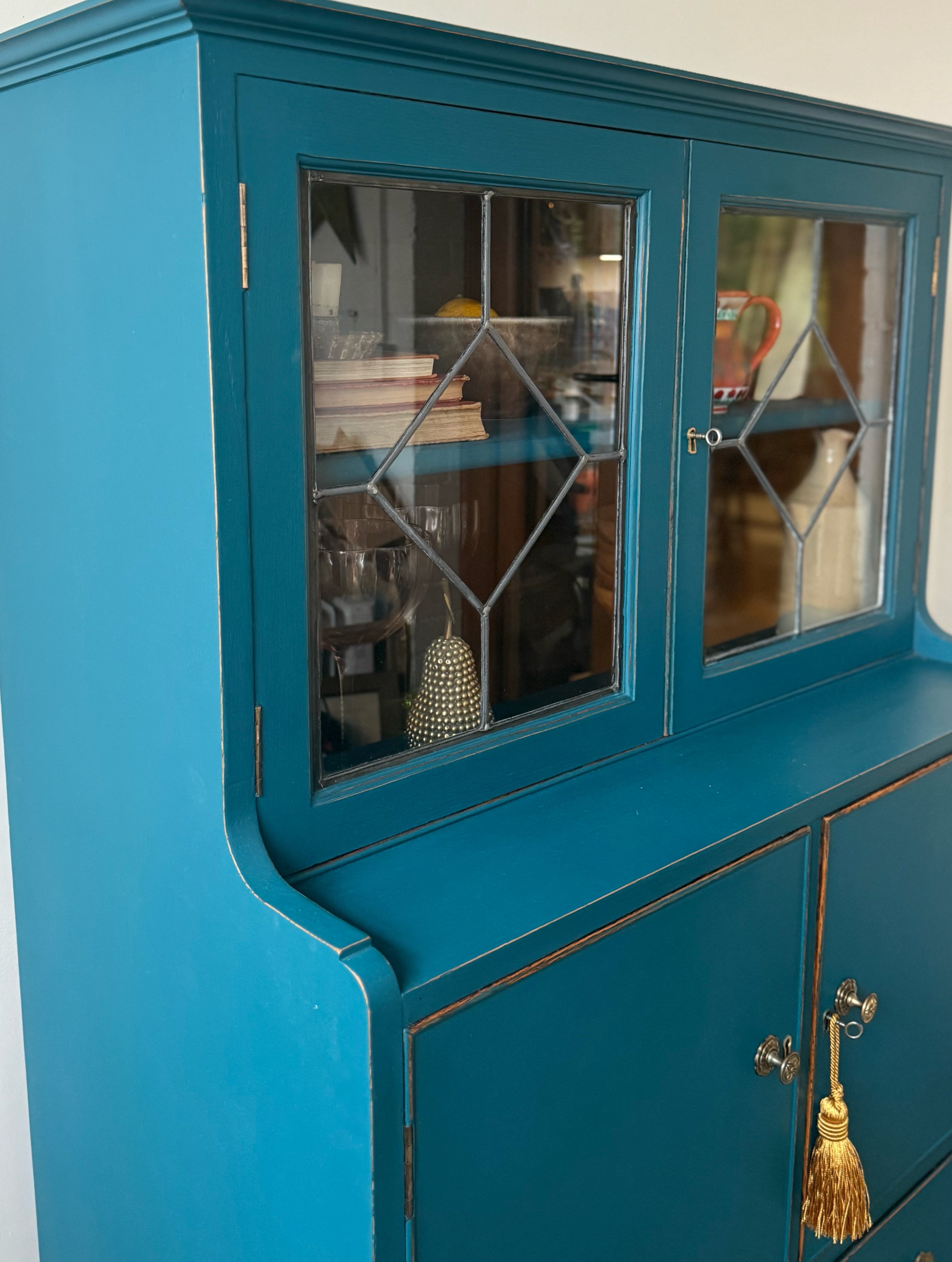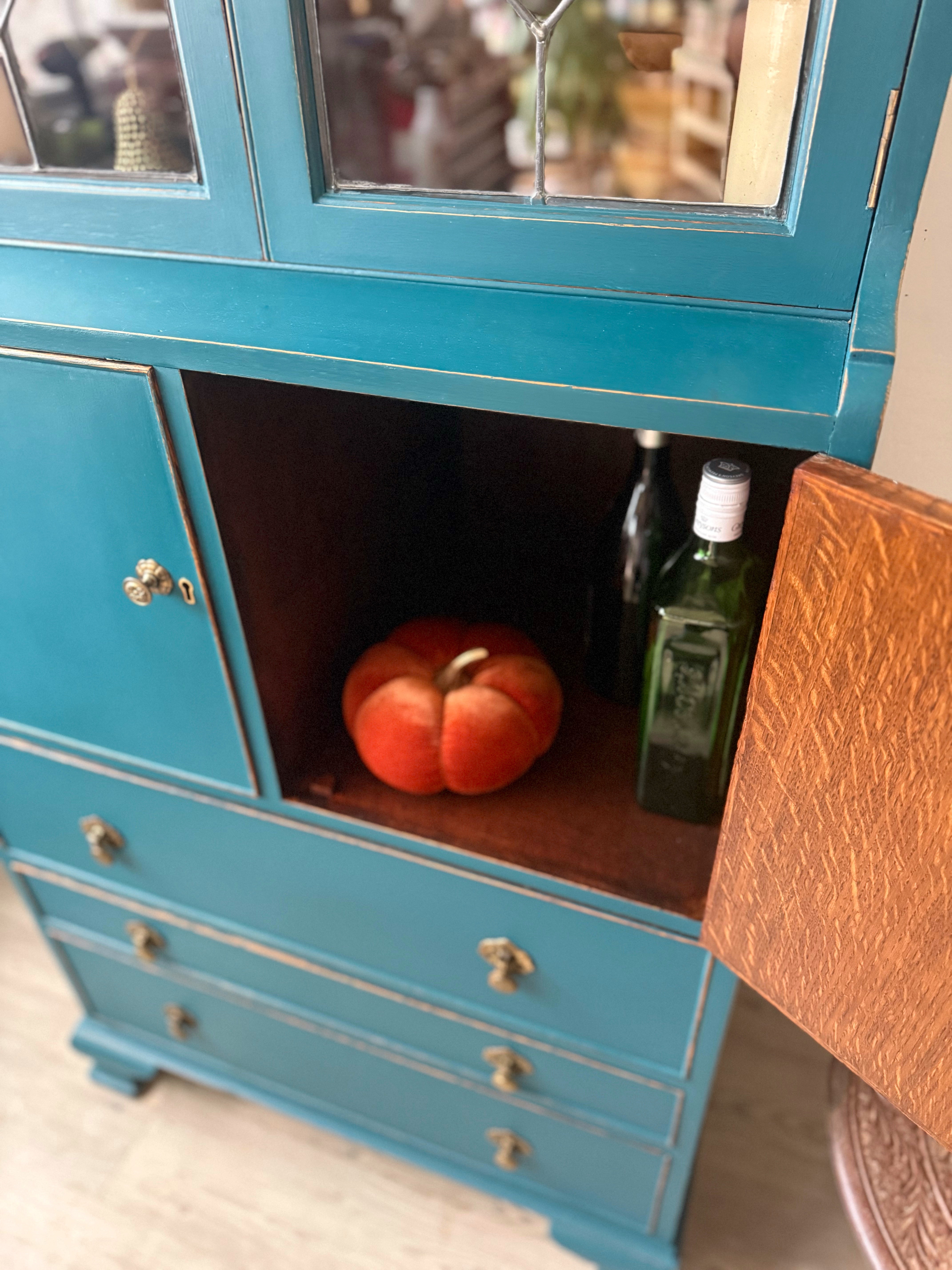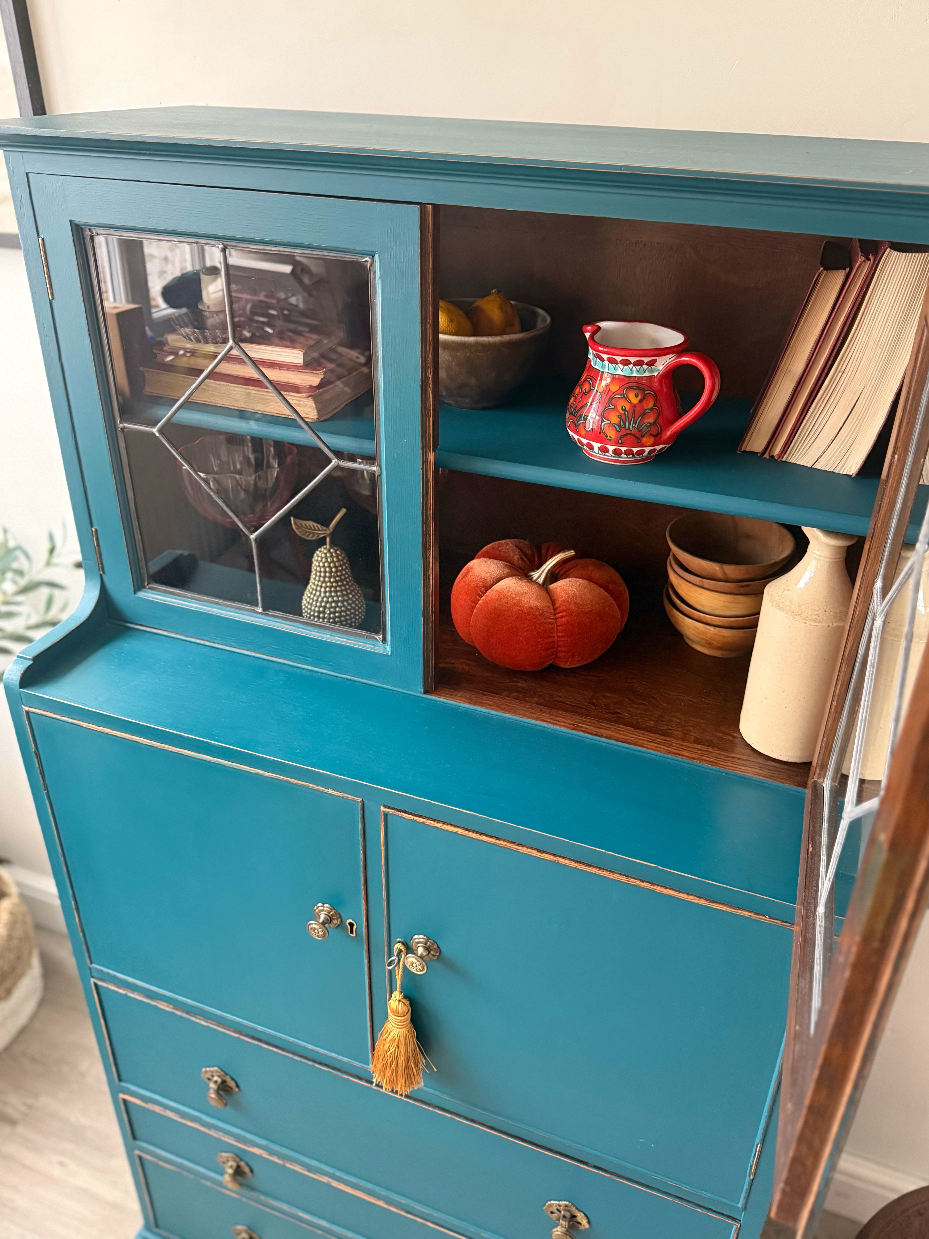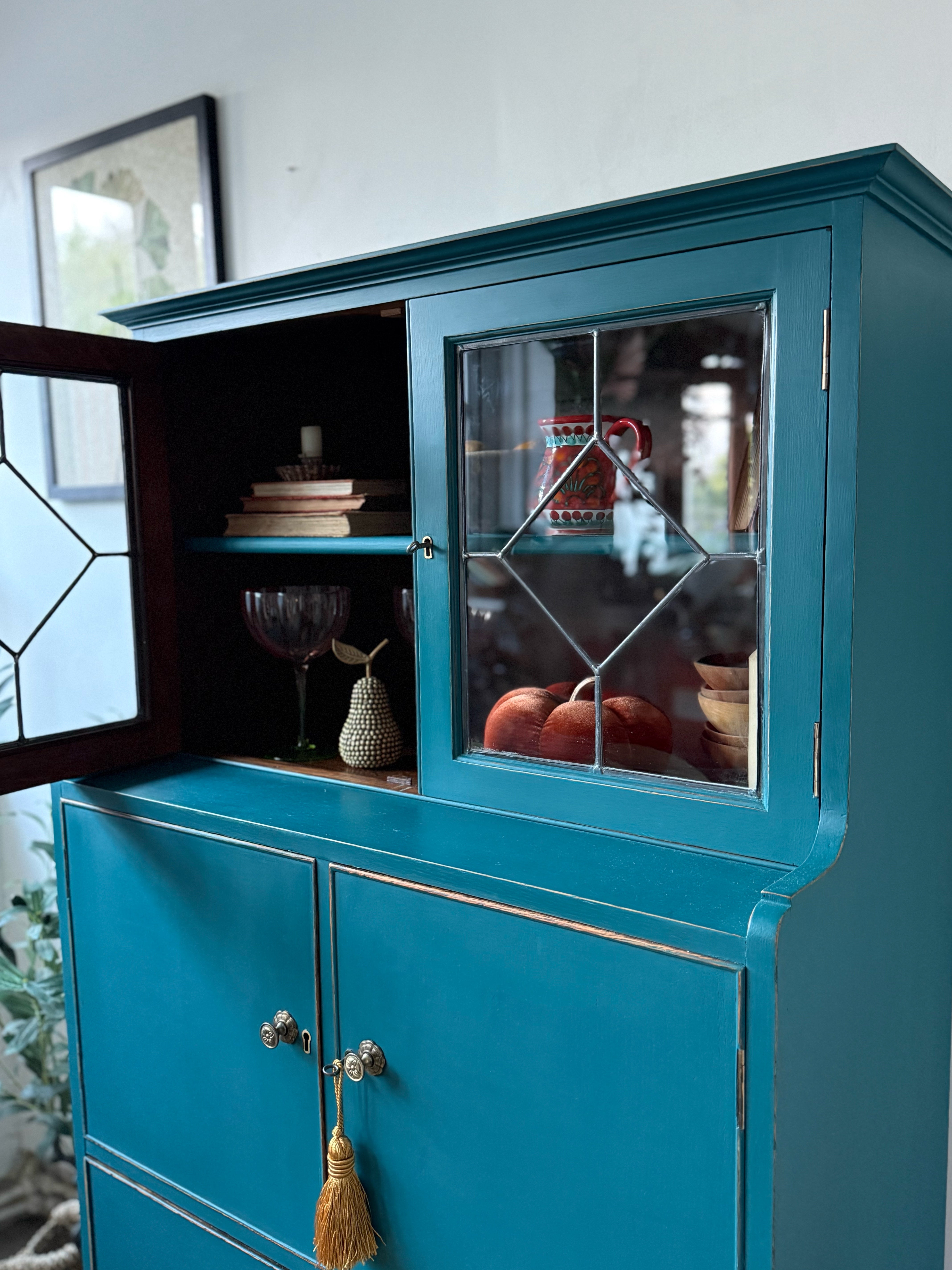 This is a solid vintage oak glazed cabinet that has been fully updated with a rich, deep teal paint finish. The paint has been lightly distressed to enhance its original character and then sealed with a protective waxed finish for a soft, durable sheen.