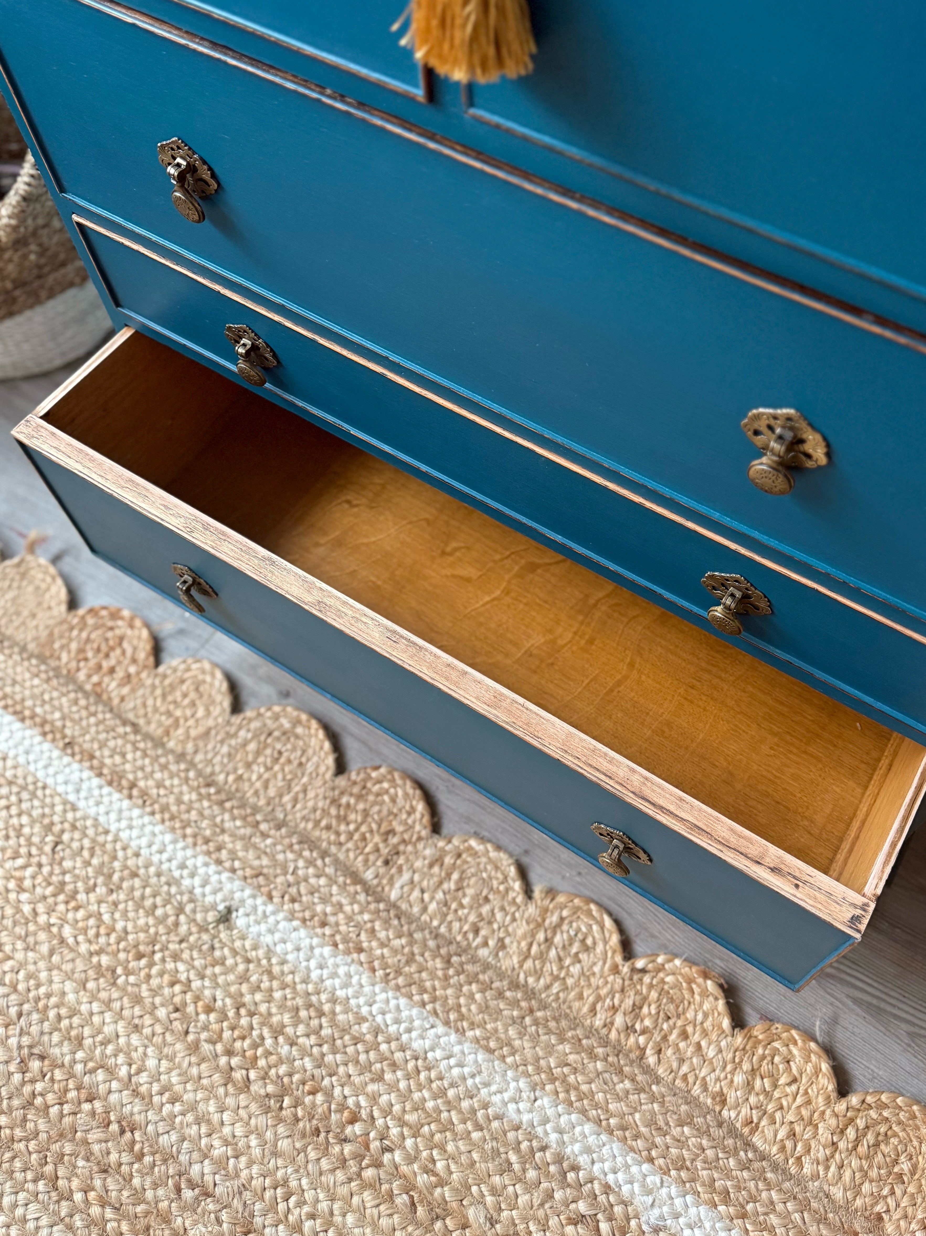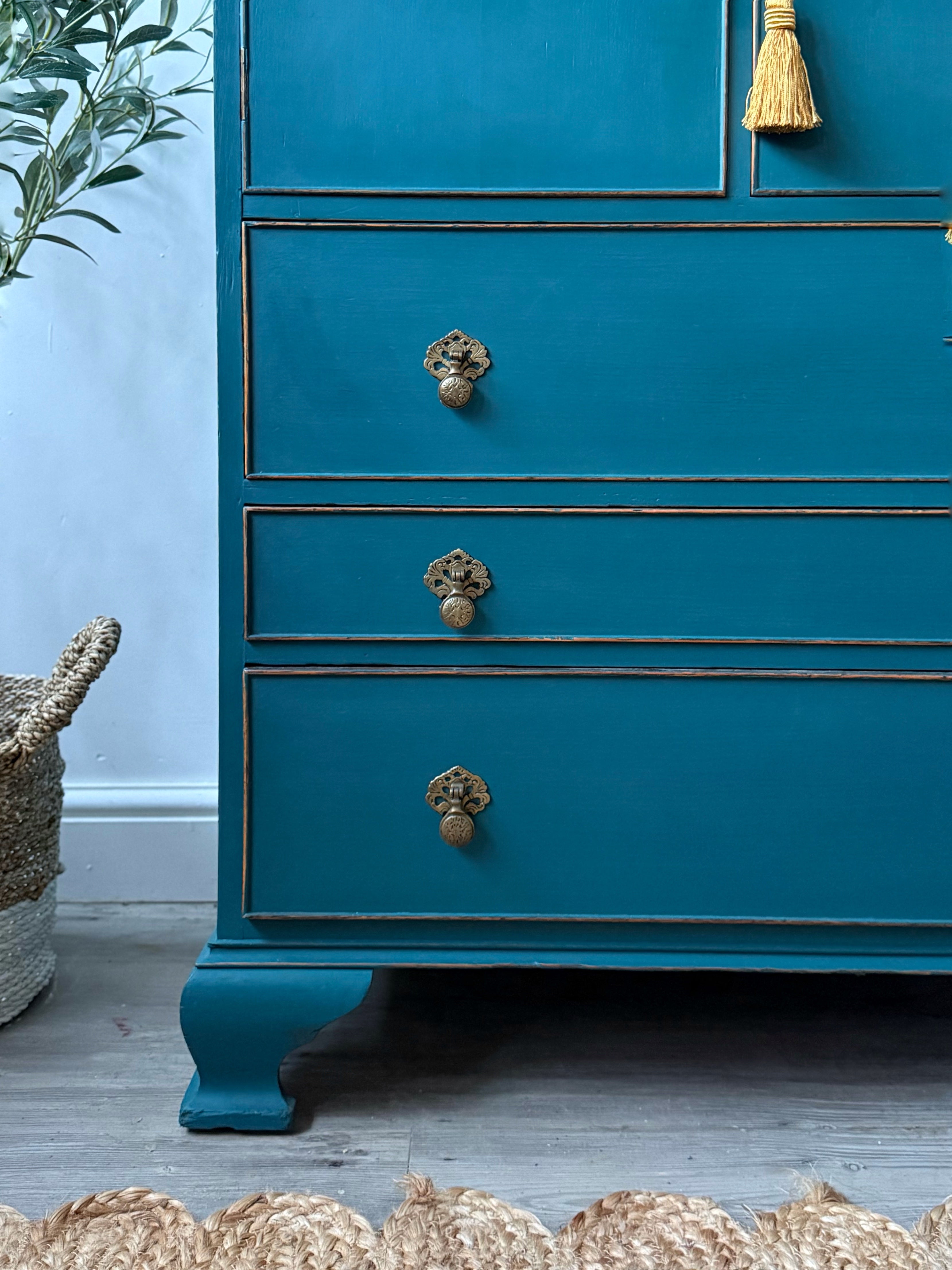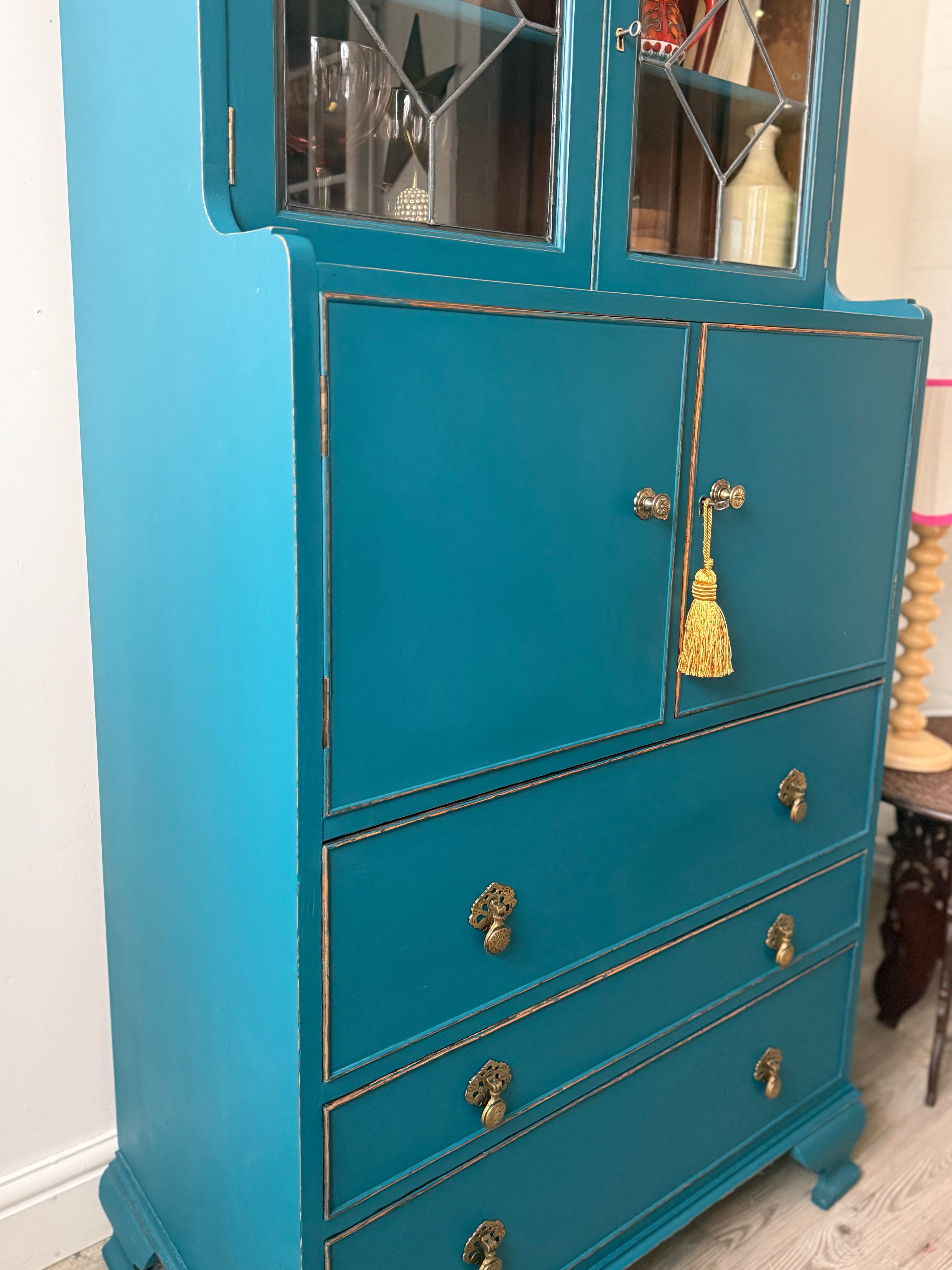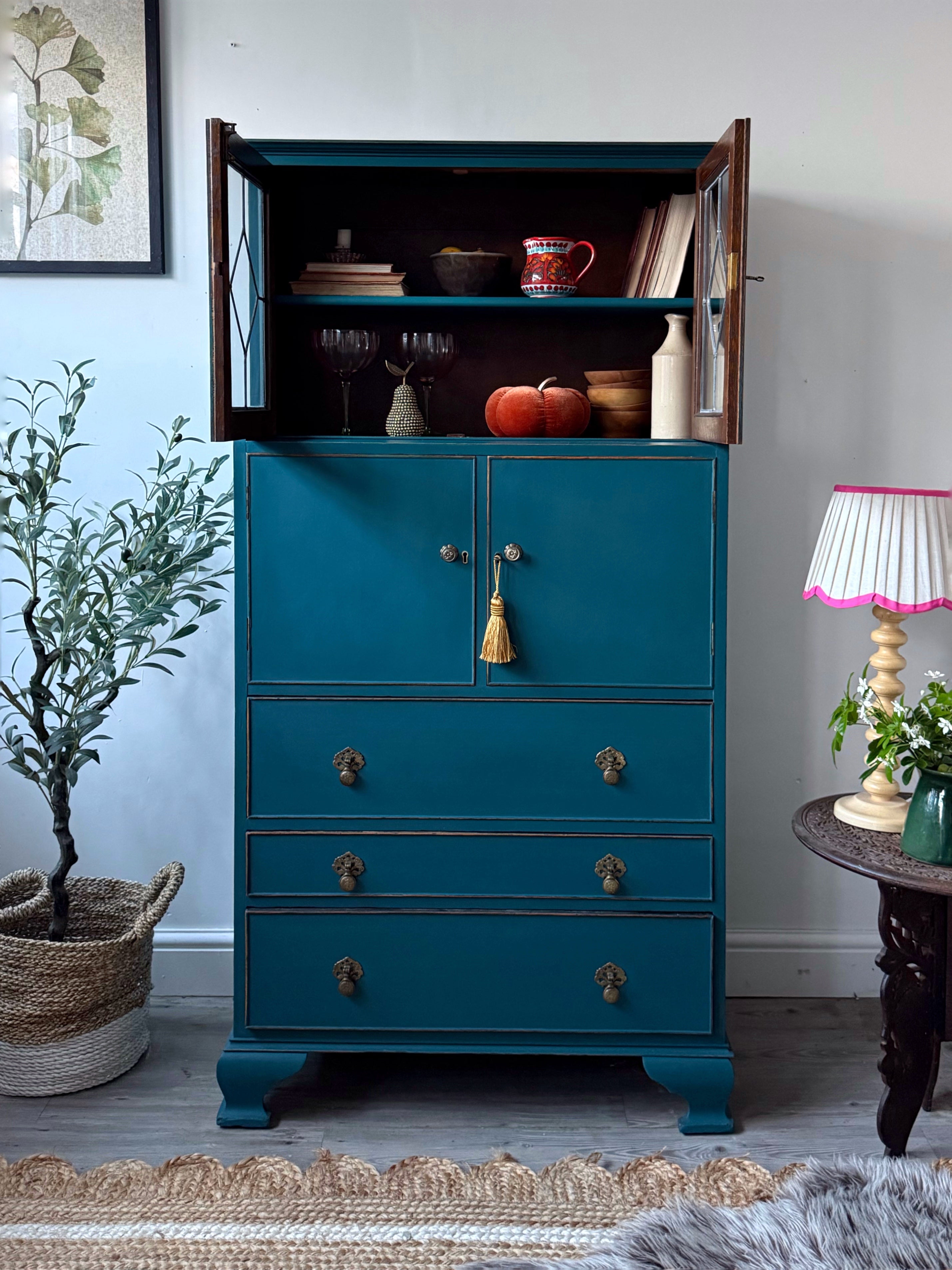 This is a solid vintage oak glazed cabinet that has been fully updated with a rich, deep teal paint finish. The paint has been lightly distressed to enhance its original character and then sealed with a protective waxed finish for a soft, durable sheen.